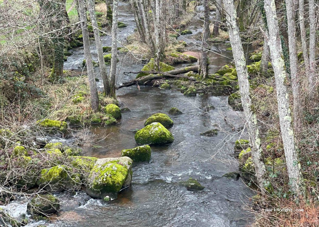 Nous nous sommes stationnés environ 100m avant le point indiqué. Stationnement à plat. Endroit très calme près d’un plan d’eau avec table de pique-nique et barbecue en pierre à disposition.