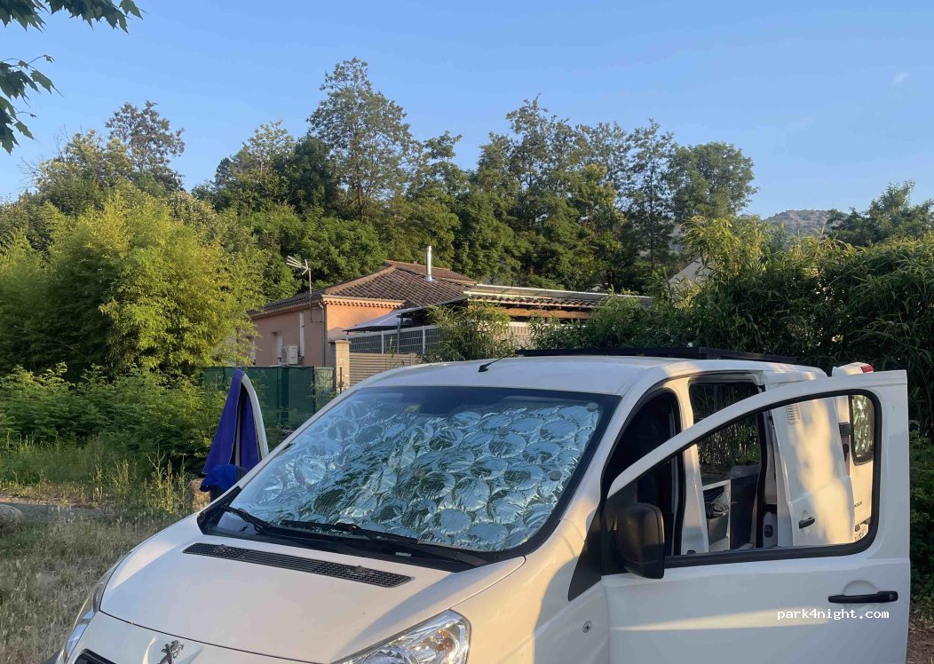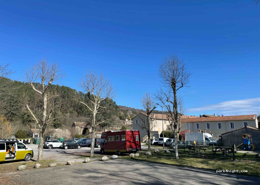 Parking at the foot of the center of Jaujac. It is possible to be able to spend one or more nights there, knowing that there are trash cans but also a tap to fill your bottles! Playground for children and a skate park. Uncrowded place! But beware of Tuesdays and Fridays, in the mornings the Jaujac markets take place (not in the parking lot), so there will undoubtedly be plenty of cars parking there! Opposite with the houses, but practical to help out for one night.