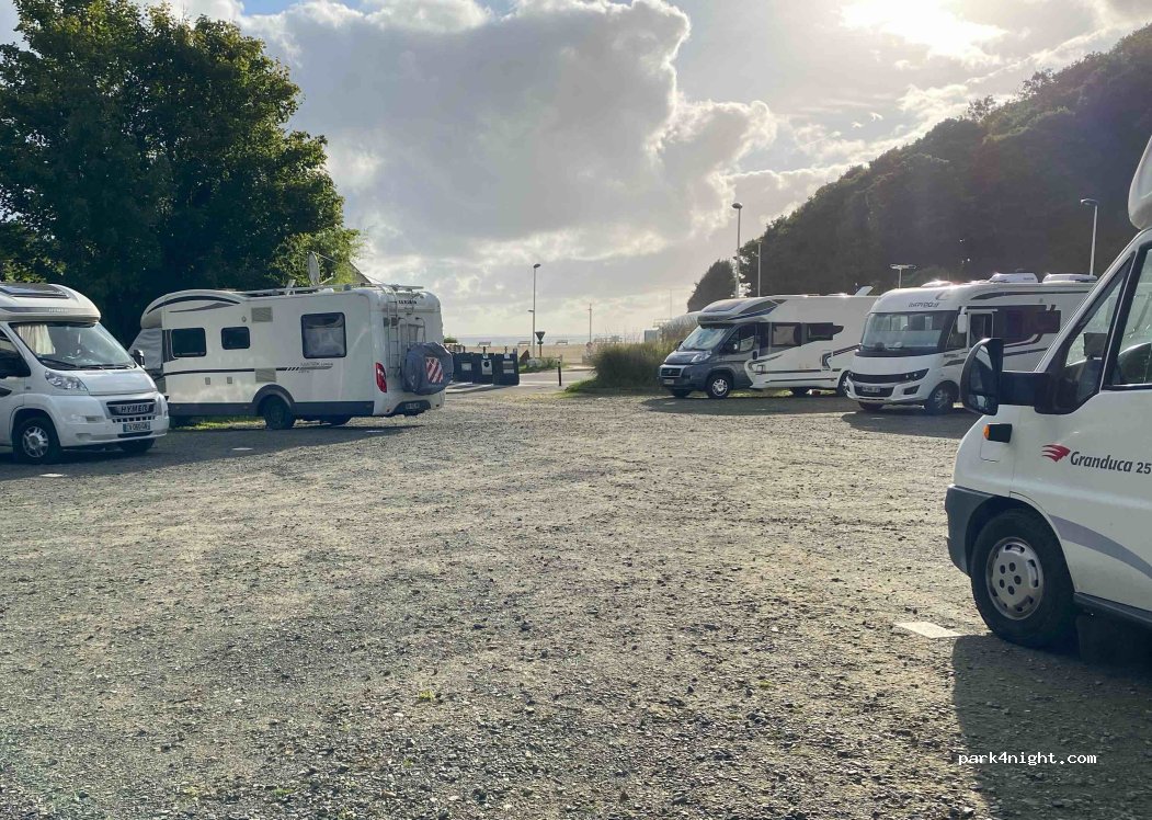 Arrived 5pm on a Friday and still 3 spaces, when we left Saturday 8 spaces. Most people park outside during the day where they can still access the water and toilet empty facilities for free. Nice walk over to headland to port and little town. Lots of cycle routes, clean toilets on the beach. Beach seaweed and rocky/stones with a sandba.