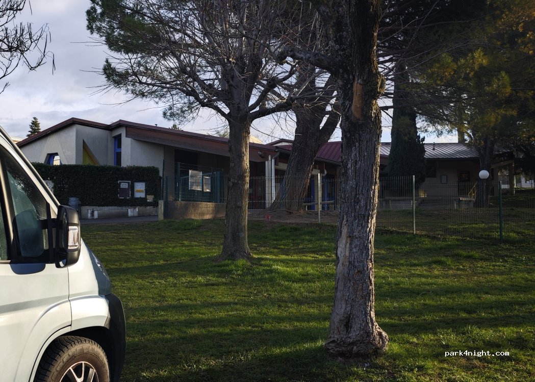Parkeerplaats bij een school. Vrijwel leeg toen wij aankwamen, stonden samen met 1 andere camper. Openbaar toilet en afvalbakken in de buurt. 's Ochtends wel even veel mensen die hun kind naar school komen brengen en langs een vrij drukke weg, maar geen last van gehad met slapen.