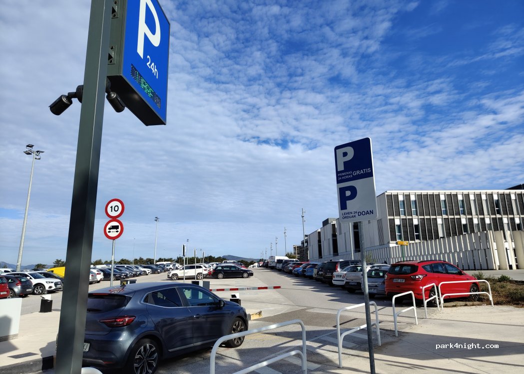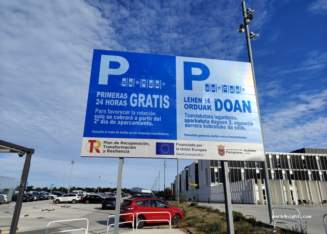 Genial! Se entra por la barrera y las 24h primeras es gratuito. Las plazas son amplias y hay muchas autocaravanas y campers. Gracias Pamplona! Si pasas de 24h pagas 4 euros por 24h mas. Y despues 2euros por cada dia. O bien salir y volver a entrar para no tener de pagar nada. No esta cerca del centro pero si del planetario.