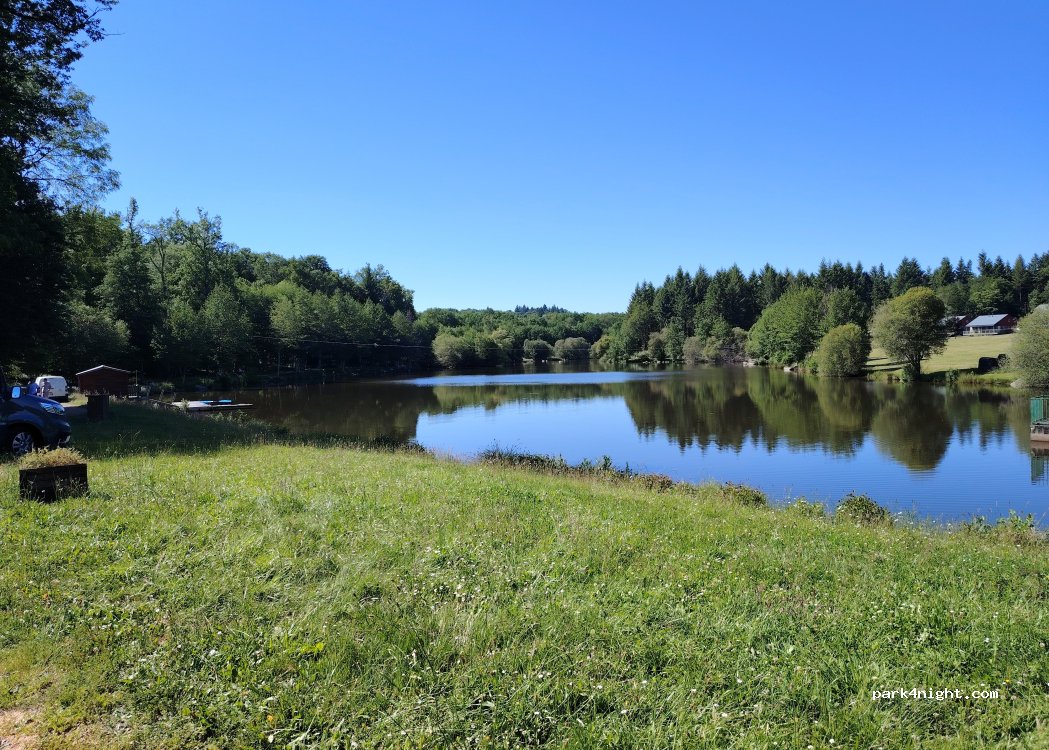 Parking vraiment en pente. Beaucoup fréquenté par les promeneurs mais calme la nuit. Balade de 20 minutes autour de l’étang. Pas de réseau pour ma part. Bonne route à tous !