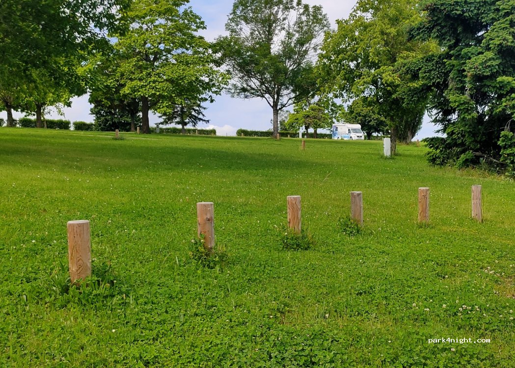 très belle aire de camping car, pelouse, arbres, au calme. Sur le bas de l'aire un petit terrain où l'on peut jouer à la pétanque avec des bancs. il est vrai que les places de stationnement sont en pente. il faut donc les cales. mais le lieu est vraiment sympa.