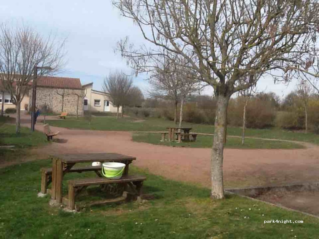 Parking and picnic area with free water point and picnic tables. We hear the truck traffic but it is reasonable, however, awakened at 6:30 by a group of men talking near us, then at 7 am by the bells of the church. Perfect for breakfast lifts ...