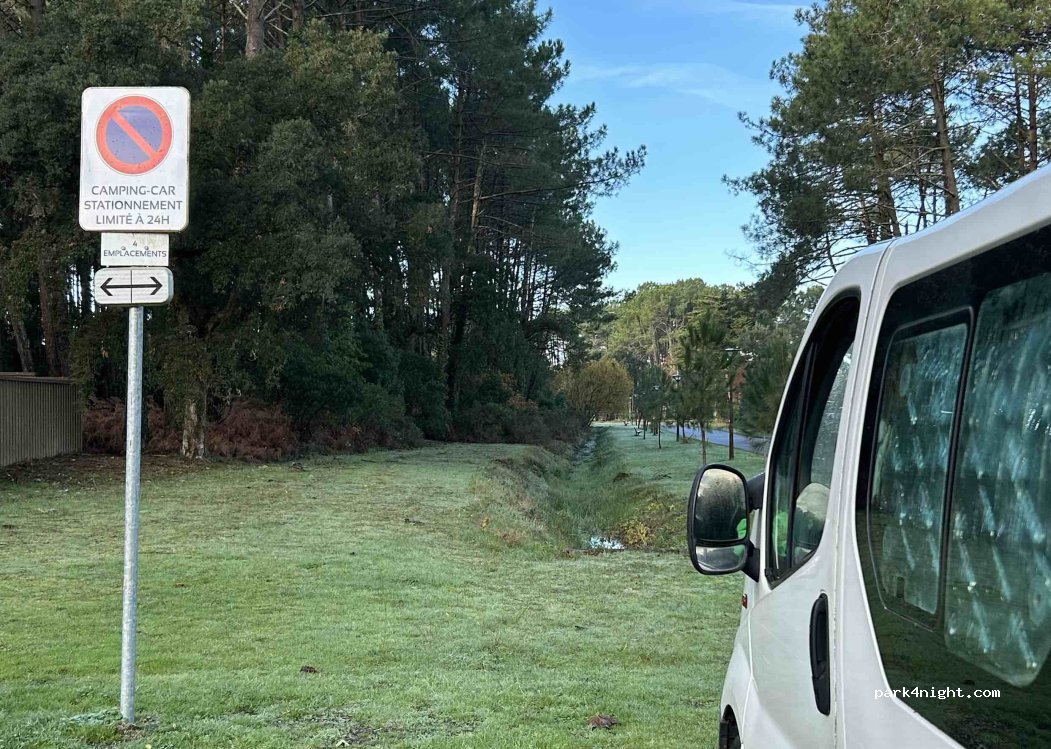 Parfait pour une halte secteur pavillonnaire sur parking gravillonné Stationnement inscrit pour 4 CC sur panneau 15 min à pieds ou 5 min en vélo du centre-ville PM qui passe le soir pour relever les immatriculations pour le respect de l’arrêté Merci la municipalité