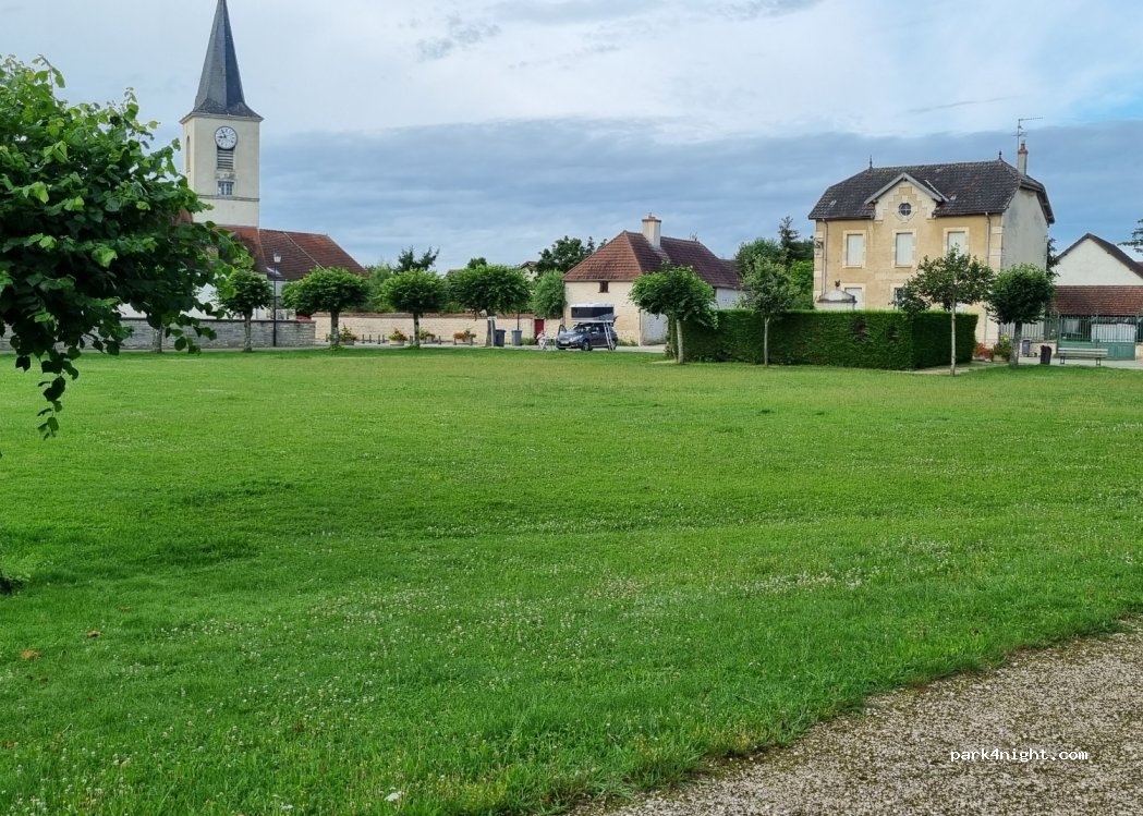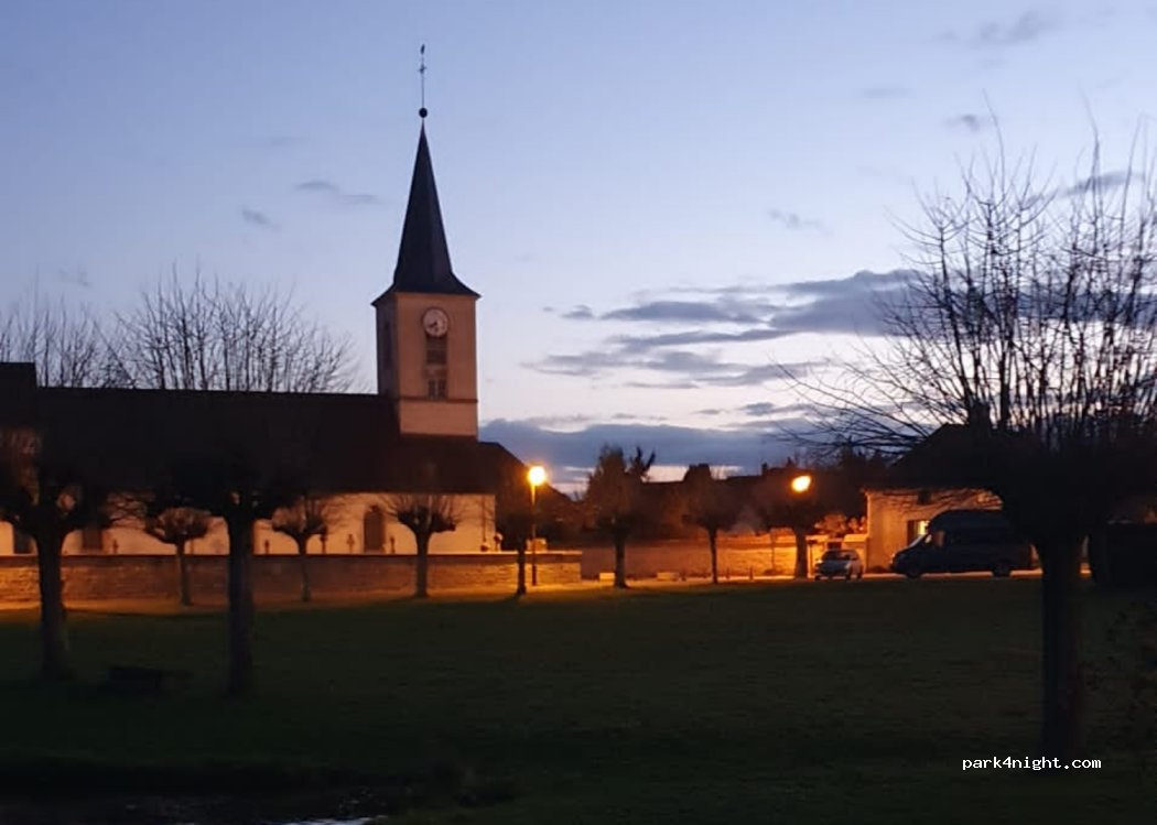 Very nice parking lot to stop during the day, and at night. Pretty seen on the castle of the village which can be visited. Bakery and commerce in the village. Small river flowing with its credit. At the foot of the church (does not ring from 10 p.m. to 8 a.m.)