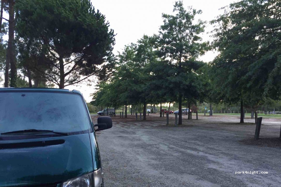 Bourgailh car park, flat, shaded but beams at 1.90m at entrance. No restriction to spend the night. No police. In the evening there is still a lot going on at the playground, but very quiet at night from about 10 p.m. until 8 a.m. when some joggers are out and about!
