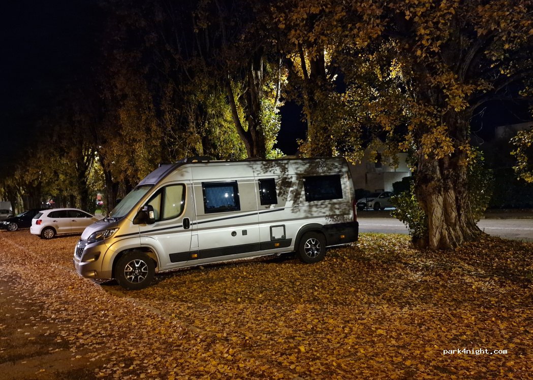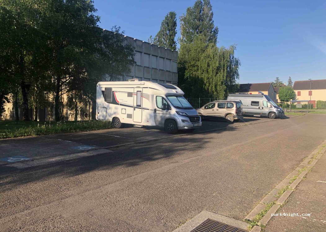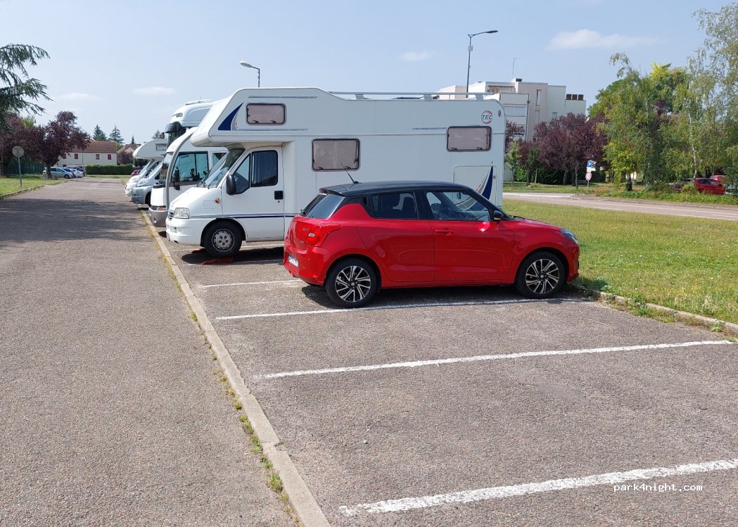 Free parking on the outskirts of Beaune. Walking distance to the city center but still free and quiet. Gas station nearby. The surface is a little bit skewed so ideally, you use a block to be level. Easy to drive in and out.