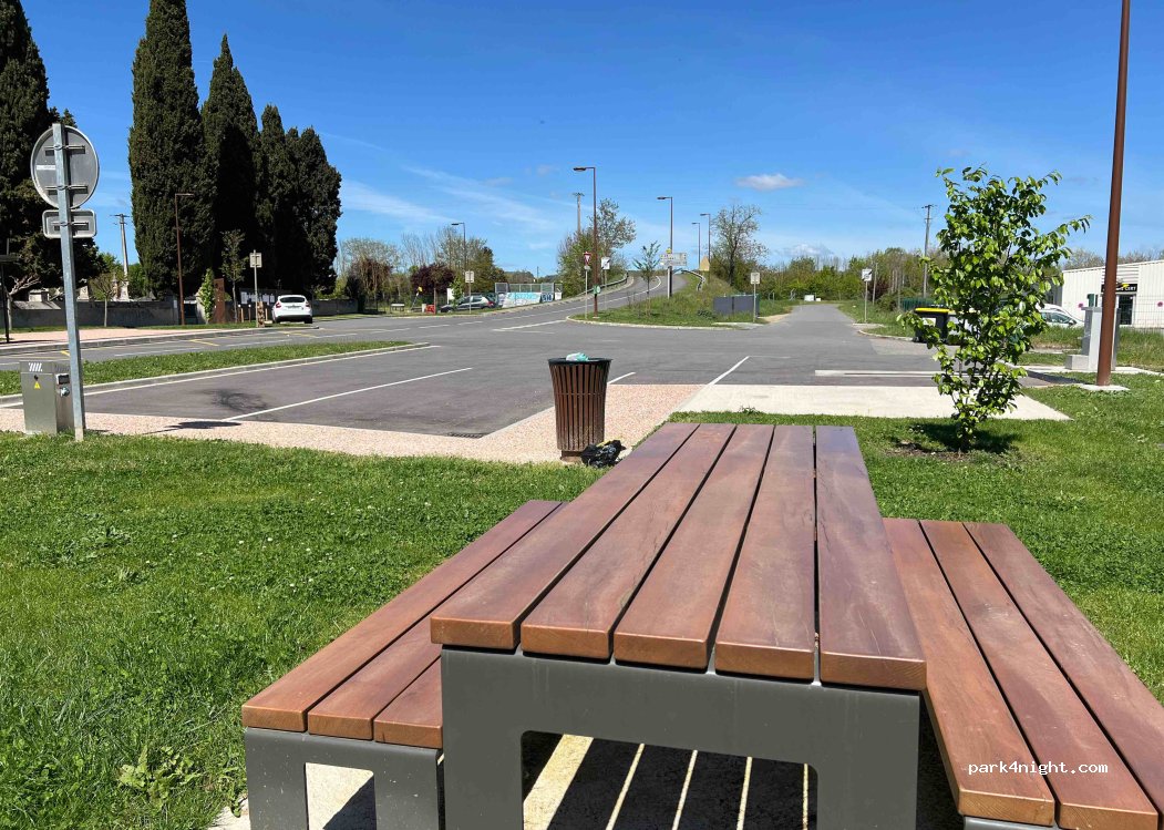 Tout fonctionne même si le débit d'eau n'est pas terrible. Service gratuit et deux emplacements avec électricité pour passer la nuit. La zone semble très calme mais il n'y a rien d'intéressant autour. Attention aux hauteurs pour passer de l'autre côté de l'autoroute en venant de Toulouse. Il faut traverser en face de l'aire pour avoir un pont.