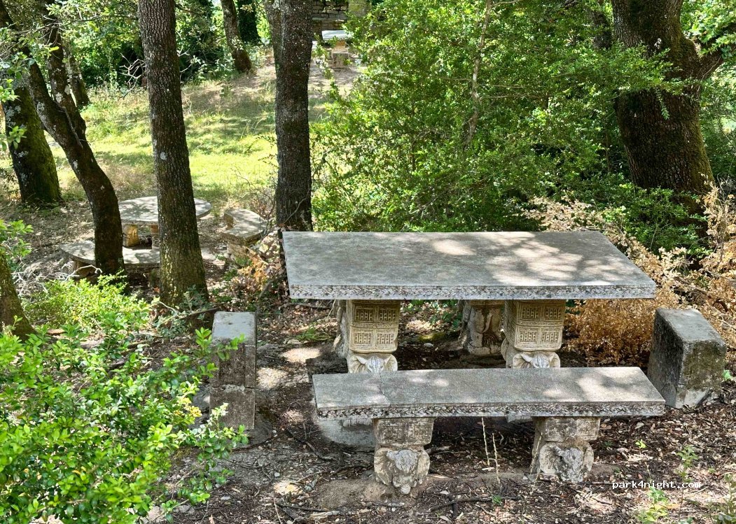Naast het klooster van Leyre, aan het pad naar de bron van de maagden. Veel schaduw. Een beetje ongelijk. Super rustig en met schaduwrijke tafels.