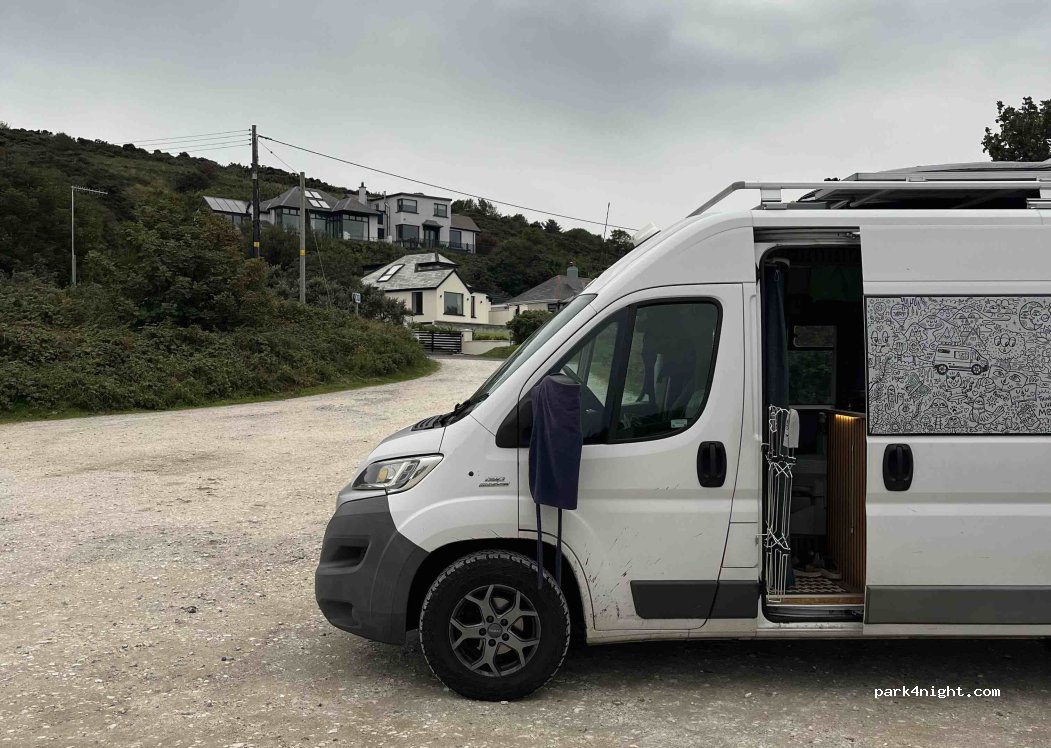 Whiterocks Beach, estacionamiento superior. Es el único sin restricción de altura. Aparcamiento de piedra, plano y con mucho espacio.