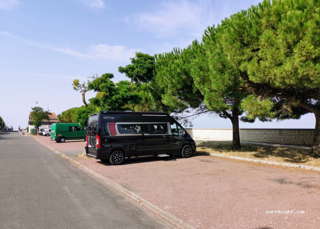 Magnificent day and night parking, with a 48-hour limit for parking (municipal decree). Superb view, with beach and sailing school nearby. Public toilets nearby (walking towards the beach) very clean but closed at night. No problem to park with our 7m long camper van backing up well. Space even in August, ideal for going to the Ile d'Aix.