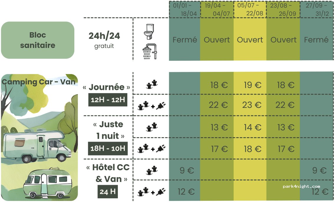 *Le tarif inclut, pour une durée maximale de 24 heures, un emplacement avec accès à l’électricité (10 A) et à l’eau pour un camping-car ou un van (équipé de sanitaires).
