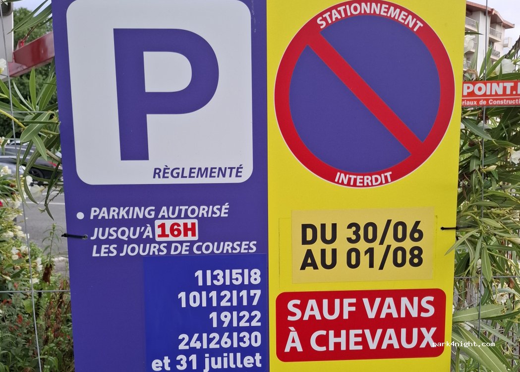 Parking gratuit, à côté de l'hippodrome, possibilité de passer la nuit sans problème. Hélas pas très grand, la moitié du parking étant réservée pour l'arrivée des vans à chevaux. Attention, interdiction de se garer à partir de 16h les jours de courses les 2-5-7-9-11-13-15-19-21-23-26-28 juillet 2022
