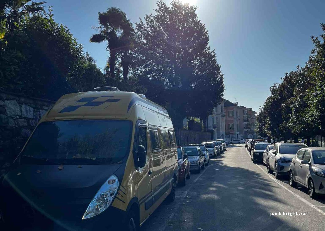 Wir konnten hier mehrere Tage problemlos mit einem PKW stehen. Der Platz ist voll, die freiwerdenden Parkplätze sind nach 30 Sekunden wieder besetzt. Aber man kann mit etwas Geduld einen Parkplatz ergattern. Toiletten tagsüber (7-19) an Boots Anleger zu der Isola Madre. Nachts, absolut ruhig. Achtung, die vorderen Parkplätze Richtung Bootsanleger sind für Anwohner und werden kontrolliert.