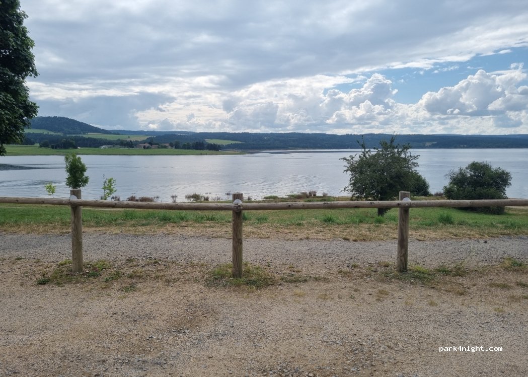quelques places devant la barre de 2.20 pour pouvoir se garer avec un plus gros gabarit. toilettes publiques ouvertes. très jolie vue. lac calme et agréable