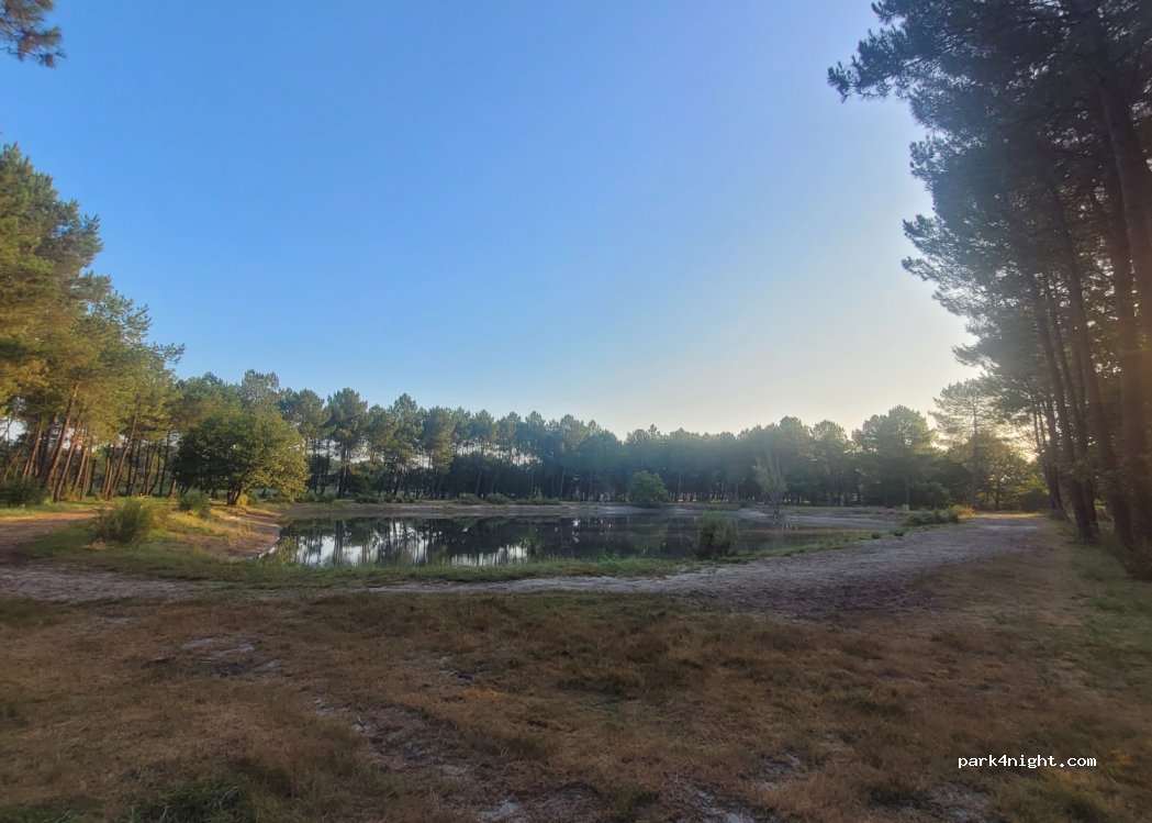 Un lieu par fait ! c'est très beau: petit étang au milieu de la forêt de pins. apaisant, calme, beau et pas loin de l'a63. le train passe à côté mais on ne l'a pas entendu cette nuit. on a adorÉ ce lieu