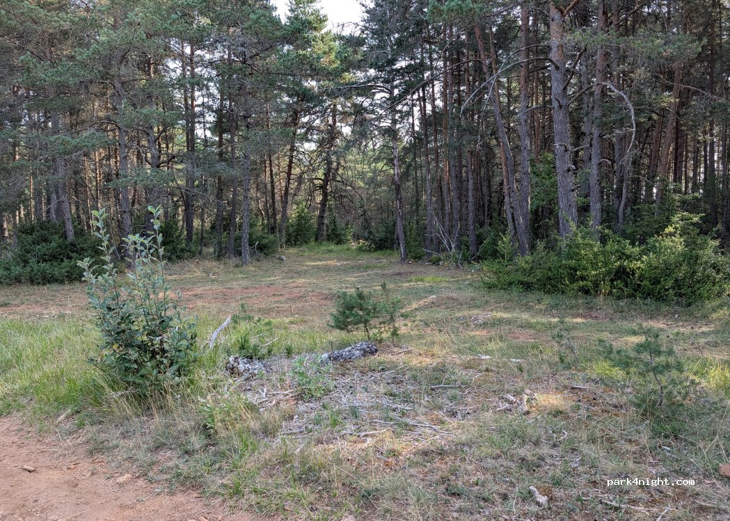 il y a plusieurs spots le long du chemin en terre. très jolies clairières sous les pins avec herbe ou mousse au sol. attention au pierres qui peuvent être cachées par l'herbe.