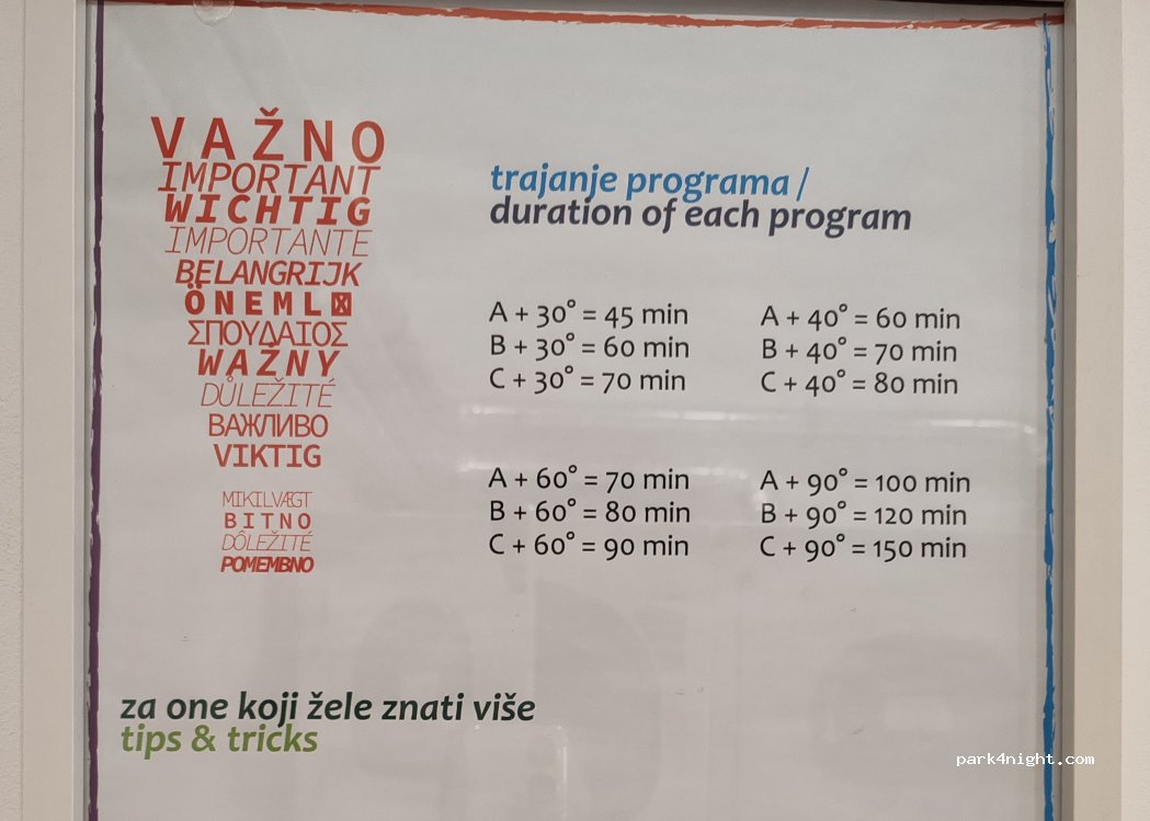 Endroit propre, coût modéré (40 Kuna pour 30 min de machine + 30 min de sèche linge). L’accès est assez simple avec des places tout le long (attention si vous avez un grand véhicule cela peut être compliqué). Seulement 3 machines alors il faut arriver au bon moment ! Merci pour le partage !