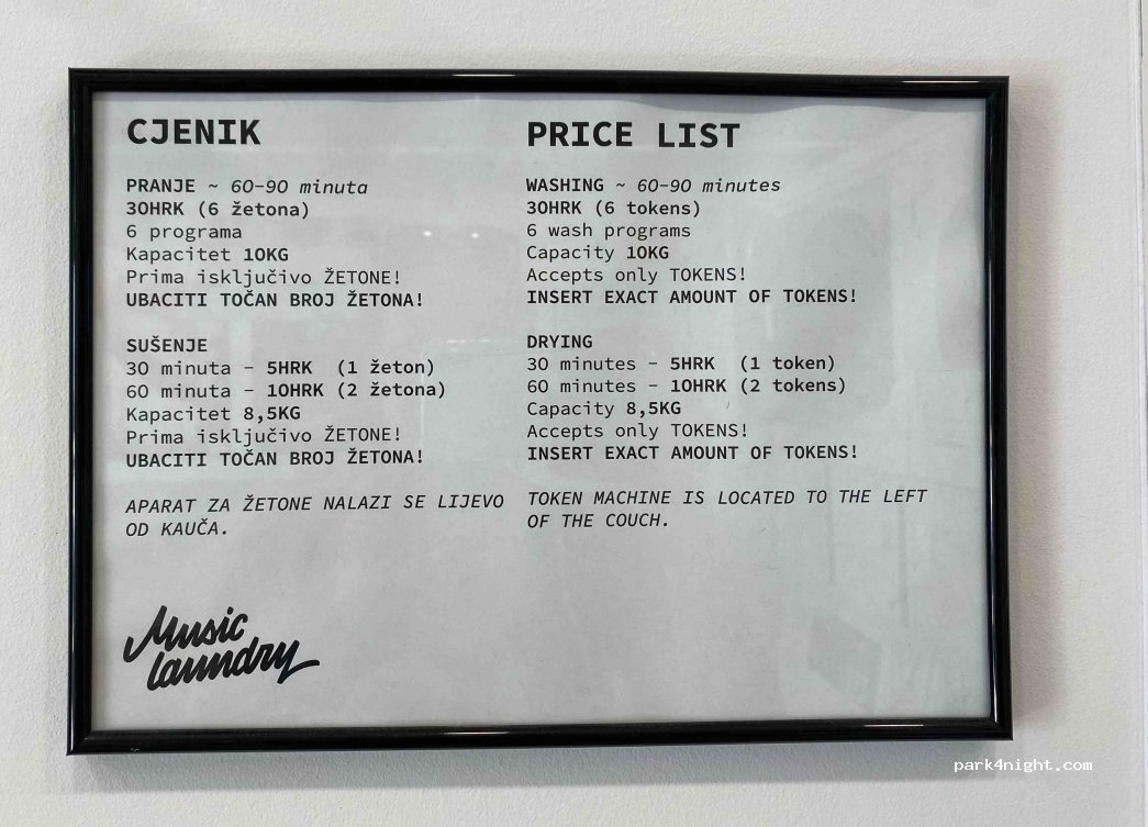 Music laundry. Laundromat. Very clean. 30 km per wash and 5kn per 30 minutes of drying. Very practical address with everything to wait (music, books, card games and pen paper!). No need to add detergent.