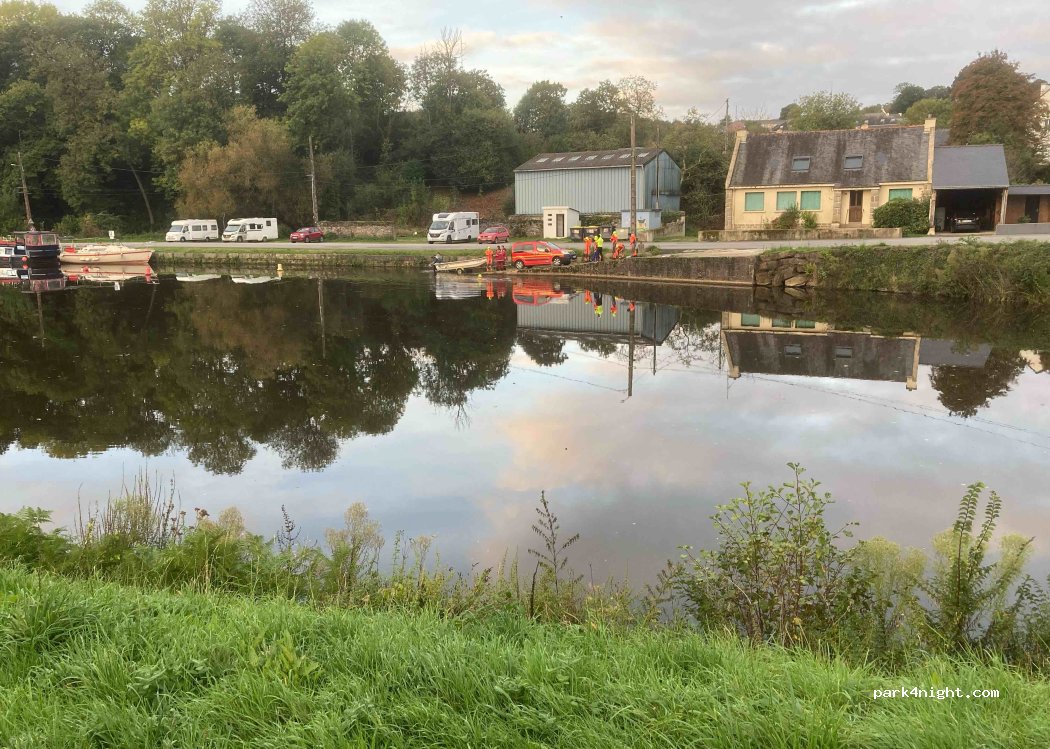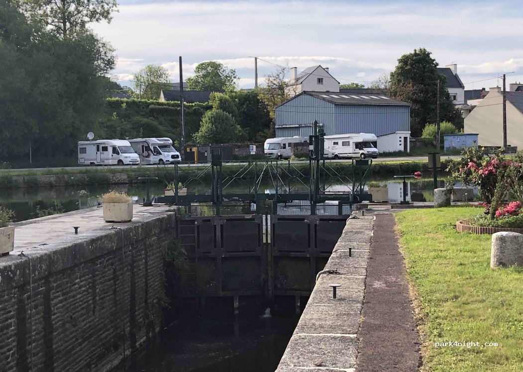 C'est une aire de parking de cc indiquée par l'Oit le long du canal de Nantes à Brest, 4, 5 camping car maxi, près des toilettes, à côté de l'ancienne minoterie, 5mn à pied du bourg ( Carrefour Express, marché le vendredi), aire gratuite sans services