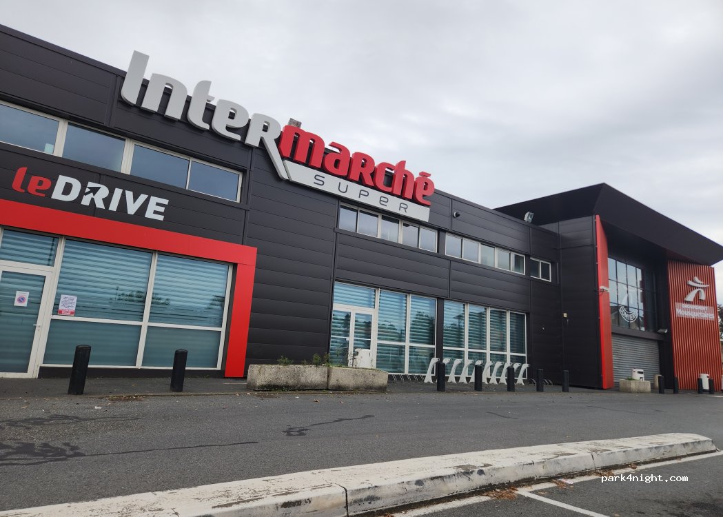 Parquing de supermercado, mejor pernoctar en fin de semana o cuando no se trabaje pero siempre de paso. Lavandería y máquina de pan al lado, algún restaurante y sandwichería cerca, máquinas de recarga de gas con bombona francesa. Hay vías del tren al lado, solo han pasado un par en toda la noche.