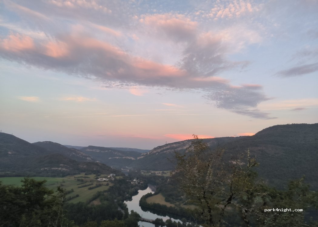 Arrivé de nuit, déjà un van sur place, facilité de stationnement, endroit un peu en pente mais ne gêne pas, quelle vue au petit matin avec le levé de Soleil sur la vallée de la Rivière de l'Ain et le début des montagnes du Jura. Superbe spot, paisible, propre, au frais et sans moustiques