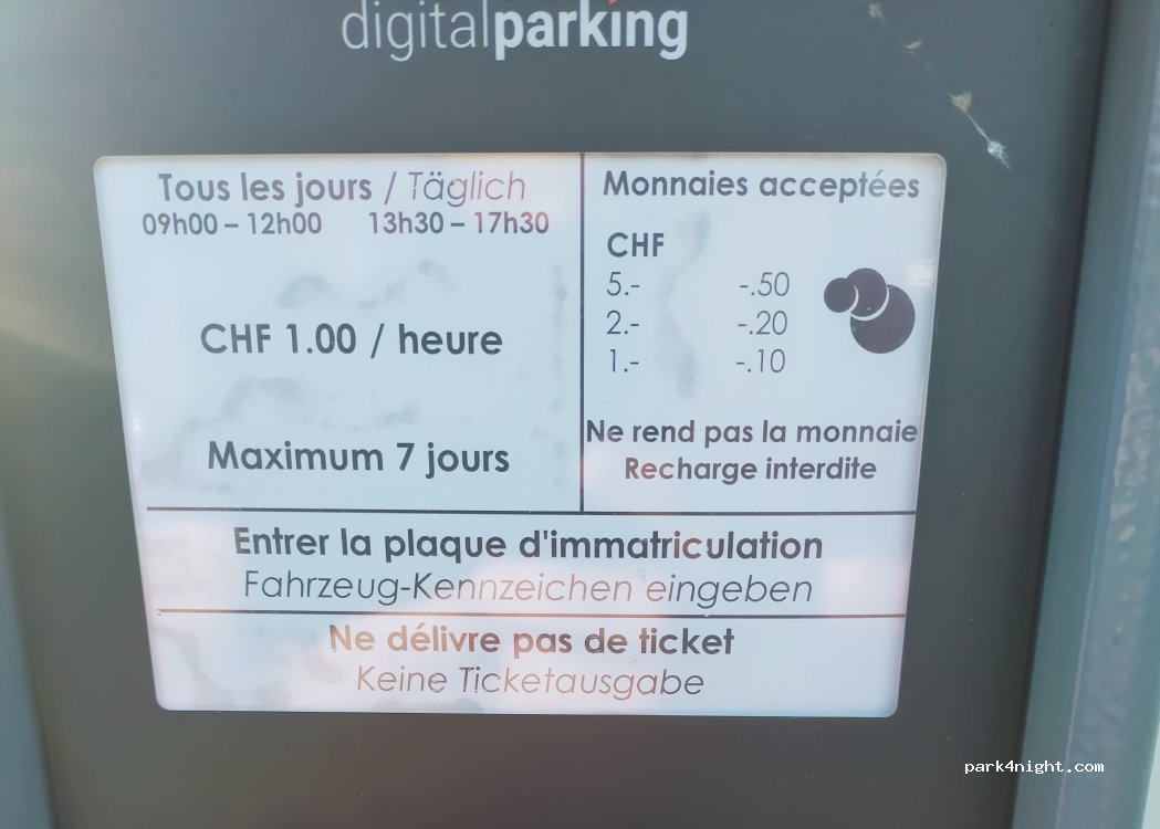 Beaucoup de place, calme a proximité du lac, toilette dans le camping permanent, petit magasin très sympa et petit restaurant très abordable et bon. Possibilité de rester jusqu’à 7 jours. Prix 7.- par jour. Interdiction de camper mais aucune loi ne peut vous interdire de dormir dans votre véhicule.