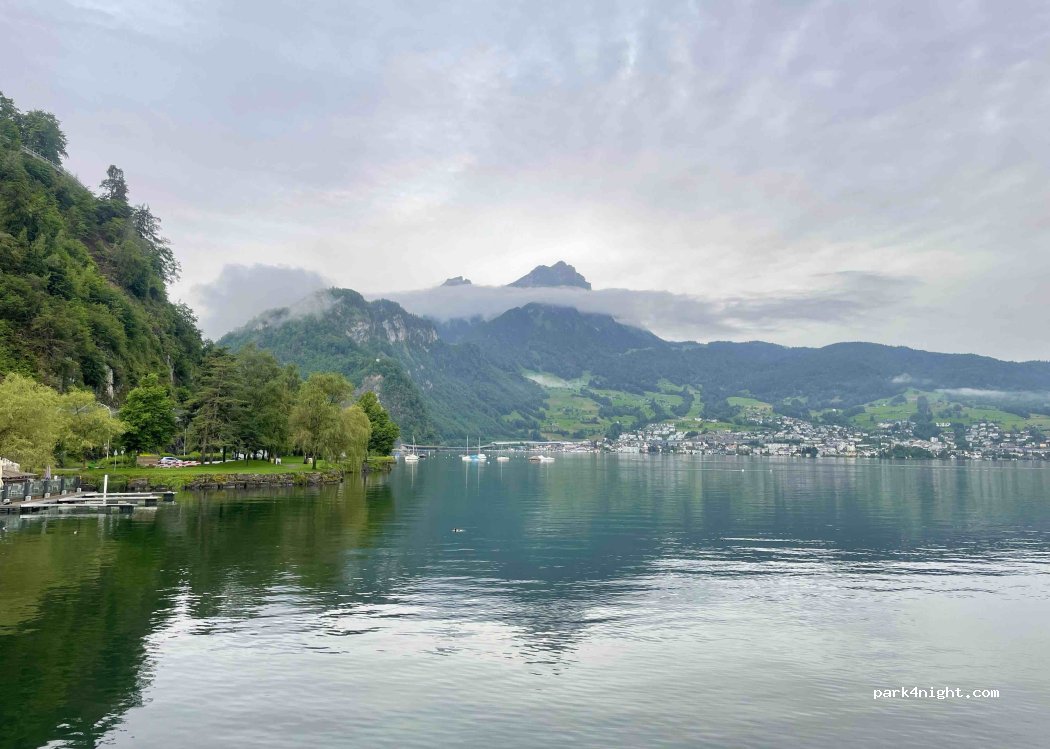 Strandparkplatz am Ufer des Vierwaldstättersees. Zahlbar von 7:00 bis 19:00 Uhr. Nur für Kleinfahrzeuge bis 6 m geeignet. Wer zu spät kommt, muss 1 CHF in die Parkuhr einwerfen und das Fahrzeug anmelden, um böse Überraschungen am nächsten Morgen um 7:00 Uhr zu vermeiden