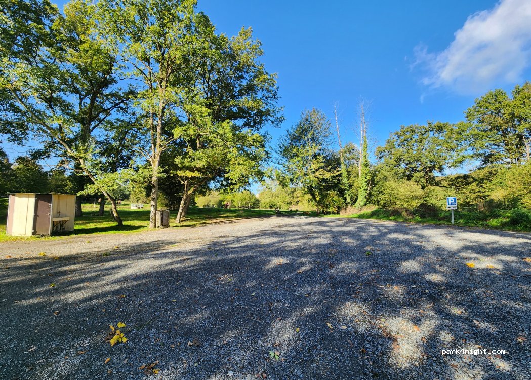 Bel endroit avec pas mal de places, des tables de picnic, poubelles, toilettes, eau potable et de l'ombre. Cours d'eau, aire de jeu, petite randonnée et restaurant à 5 minutes de marche. Parfait pour un arrêt repas et certainement pour une belle nuit au calme aussi. 2m10 maximum. Bon Trip à Tous !!