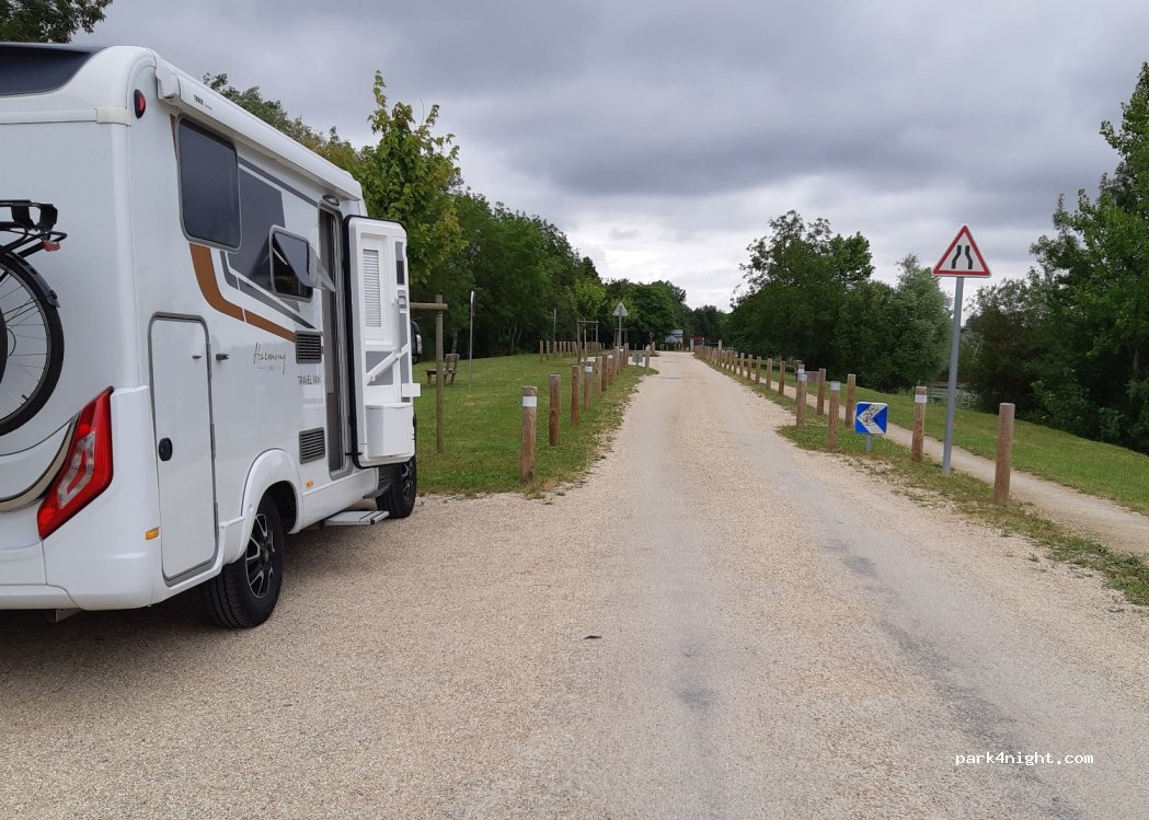Places pour 4/5 véhicules. Emplacements quasiment plats. Proximité rivière et étangs, ce lieu est unique ! Beaucoup de passage de marcheurs, pêcheurs, jeunes jusque 22h environ. Nuit tranquille ensuite. Bel endroit.