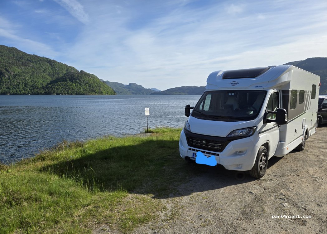 Nice flat place on the street. Beautifully located on the fjord with "lighthouse"