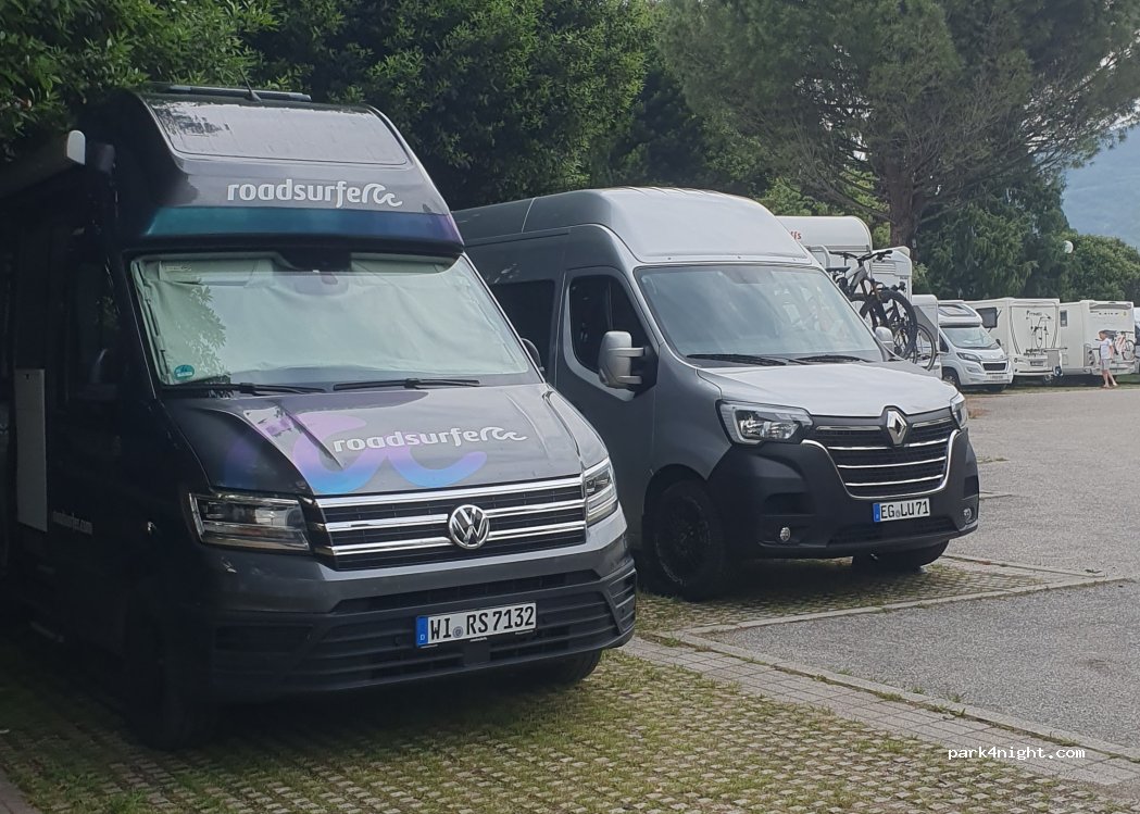 Well maintained ordinary parking space with supply and disposal point. You can stand on the court for up to 48 hours. This site is also easily accessible for large mobile homes (no height restrictions). If you leave the place, you can't come back for 48 hours. The site is close to the water and next to a police station. The COOP supermarket is about 1 km away in town. Alternatively, there is a large Lidl in Nago-Torbole, which is cheaper than Coop. Unfortunately there is no dog beach in the village itself. Walking allowed, but swimming prohibited. The dog beach can be reached on foot in about 30 minutes in the direction of Nago-Torbole along the beach near a surf school near the canal. Everything more correct. Clean, central, inexpensive. Shower. On the parking provider's website you can see in real time if there are still available spaces (right)