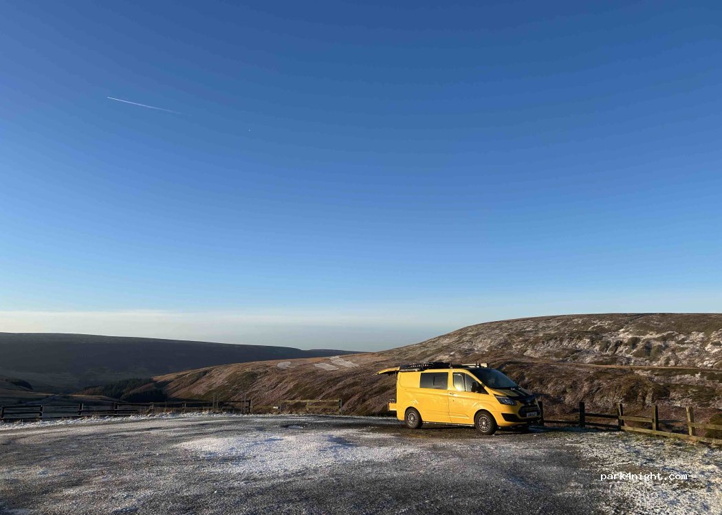 A very beautiful place to stay, fantastic scenery to wake up to. The weather was pretty rough, the side door of the van froze! It’s a very open, windy and cold park up! But was quiet, hardly any traffic and just a fabulous place to stay. 4g signal only.