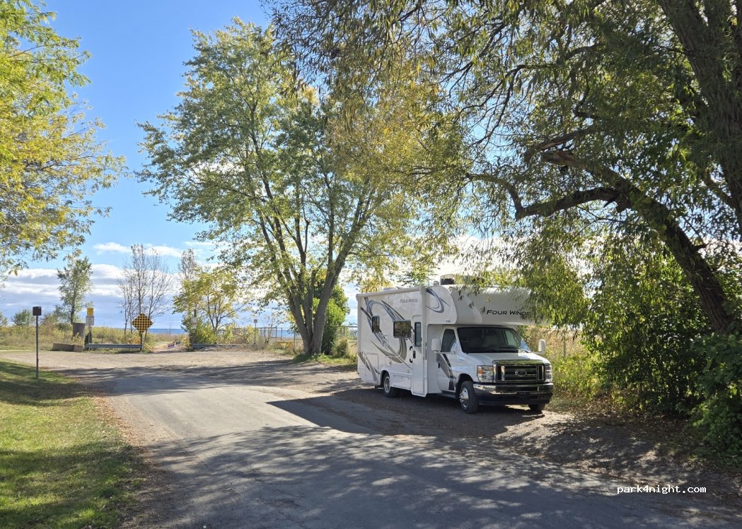 I spent the night here no issues, a nice view on Ontario Lake and very quiet no services but lots of water sports, walk, bike ...to do to spend the day books you can pick up from free books boxes real nice ! park along the fence of the park on the right side. Enjoy!