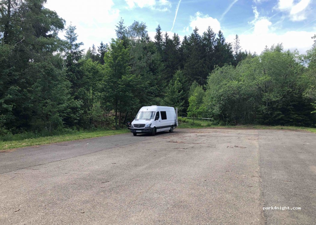 Parking occupé par des tas de rabotage d’enrobé et une pelle hydraulique. Nous nous sommes installés sur le parking de la piste de ski en lisière de forêt. Très calme et restaurant à 50 m.
