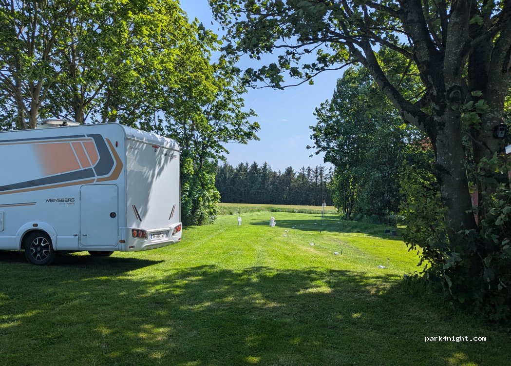 Emplacements situés derrière la maison du propriétaire, plats, spacieux et herbeux. Une prise électrique, une poubelle et un étendoir à linge mis à disposition. Accueil très sympathique du propriétaire qui est venu à notre rencontre pour nous fournir des plaques à mettre sous nos roues et nous fournir de la documentation sur les endroits touristiques de la région. Prix 75DK pour une nuit.