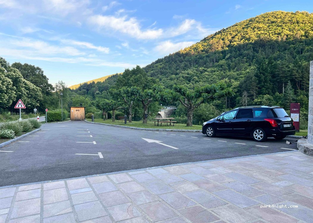 Très bien pour 1 nuit. Toilettes écologiques ouvertes très propres. Vue montagnes. Trafic non dérangeant pour 1 nuit. La tour est celle nommée "Pyramide", érigée en remerciement du fait que le cholera ait épargné la ville. La rando vers la cascade est située plus en amont de ce parking (avant le pont) à partir du belvedere (juste avant le camping qui je crois se nomme la chataigneraie).