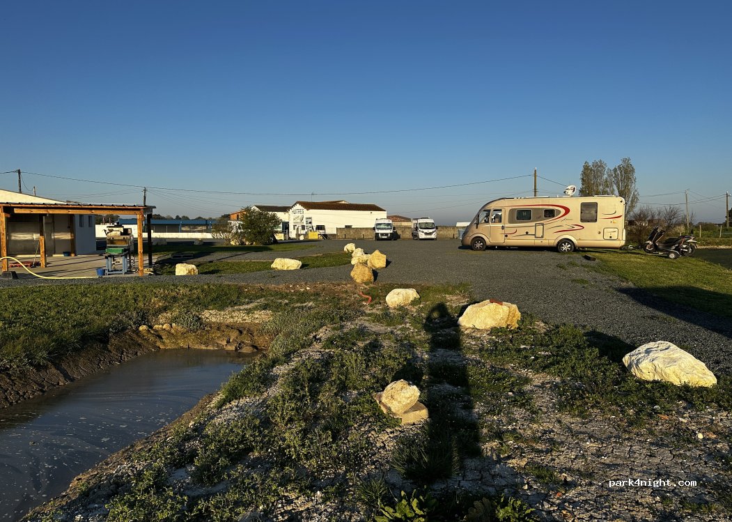We stayed two nights and shared the area with 7 other motorhomers. The owners are friendly and offer an area of free parking in exchange (goodwill only) for a few extra purchases from their shop. It's peaceful and an easy cycle to La Rochelle harbour. Ensure you have a supply of water and an empty canister. There are no facilities. It is 8 vans max so if it is full...don't squeeze in...leave!