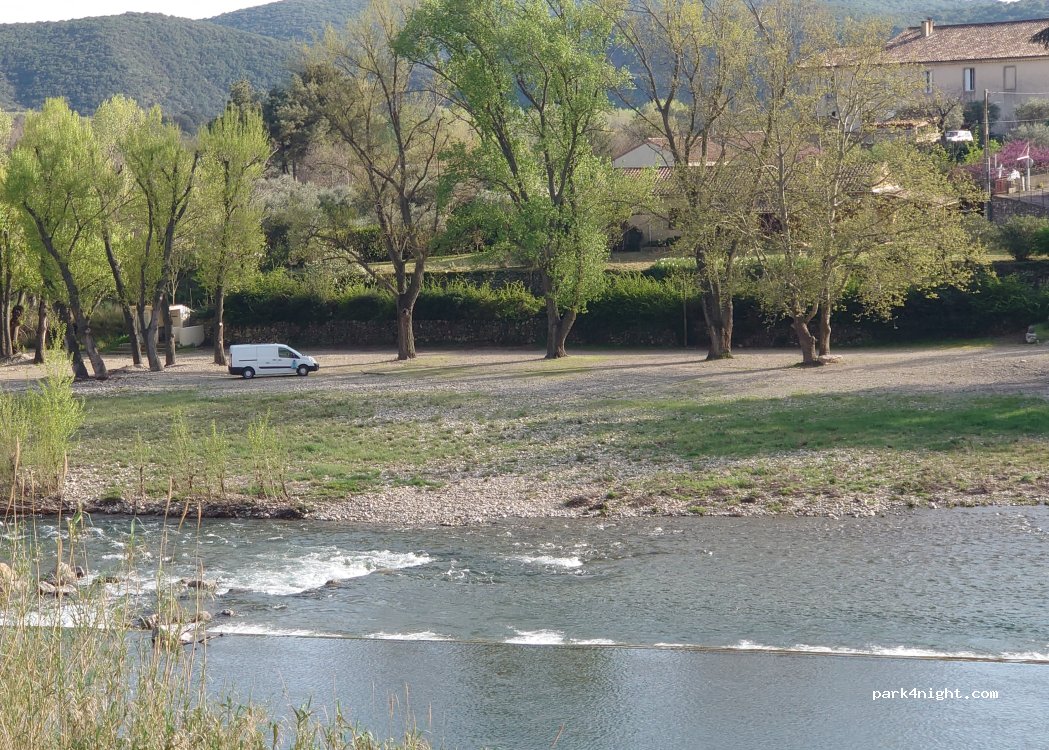 Une situation exceptionnelle au bord de l'eau avec vue imprenable sur la cité perchée, éclairée la nuit Baignade possible et le lieu devient une plage la journée Beaucoup d'ombre Parking payant mais personne à l'entrée Très paisible la nuit à part pour la cascade très bruyante d'où ma note Barrière à 2m10 Ne pas confondre avec l'autre parking réservé au club de canoë