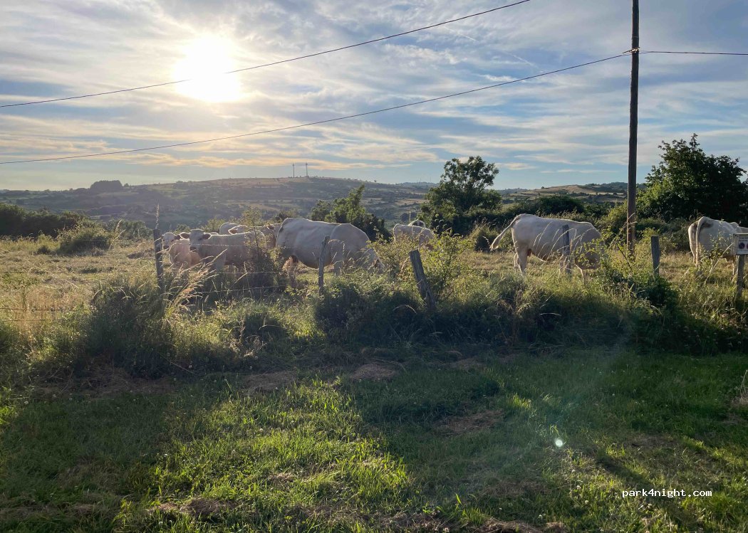 Plus que Parfait et au milieu de nul part à la fois avec une belle vue , zone vraiment bien aménagée avec poubelles tables et accès à un terrain de pétanque ainsi la possibilité de vider l eau noir . Si vous achetez quelque chose à la boutique l’emplacement est gratuit . Produits délicieux