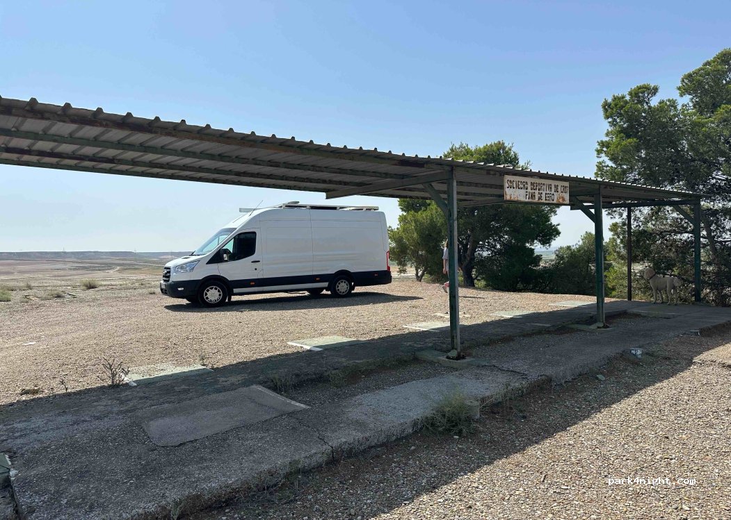 Bien ubicado para una parada a dormir cerca de la AP-2 está en una pequeña colina expuesto al viento lo que reduce mucho la sensación térmica de estos días. He tenido la visita de unos jóvenes sobre las 5 de la mañana a ponerme un poco de música y tocarme las campanas.