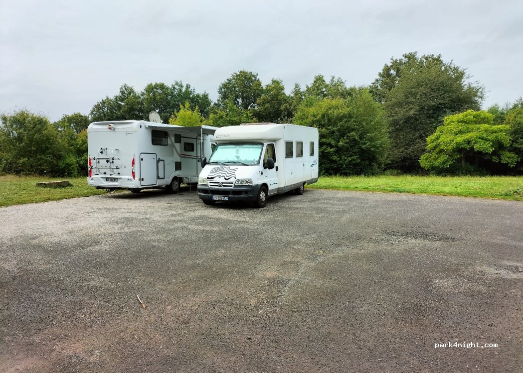 deux immenses parkings à votre disposition. préférez celui de droite plus plat que celui de gauche. nuit très calme près d un étang de pêche. il y a même des endroits pour manger à l abri, des barbecues et des toilettes très propres. un grand merci à la commune !
