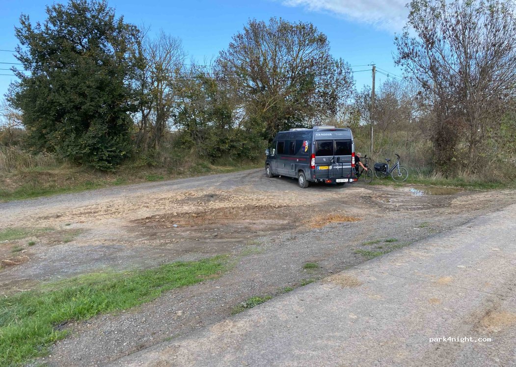 Kleine wandel P bij de kruising van Canal du Midi en een ander kanaal. Grind, redelijk horizontaal, geen voorzieningen. De officiële ingang is tussen 2 stenen door waar je met een buscamper in elk geval doorheen past (bredere camper misschien met hulp). Je kunt ook via de zijkant de P oprijden, maar dat is een beetje schuin (en momenteel blubberig). Het is aan een smalle straat, waar wel wat auto’s langskomen. Ook veel wandelaars, fietsers en ruiters. In de nacht heerlijk stil. Heerlijk fietsen hier in de regio. Wel lijken hier in de buurt enkele woonwagenkampen te zitten - waar we geen last van hadden.