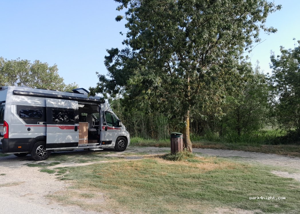Weit abgelegener, flacher Parkplatz mit Mülleimer, umgeben von schnatternden Enten, mitteilungsbedürftigen Eseln und Mücken. Anwohner mögen keine Camper und fahren Nachts, wiederholend mit hupenden Autos vorbei. Sehr uncool, nicht zu empfehlen. Seien Sie vorsichtig.