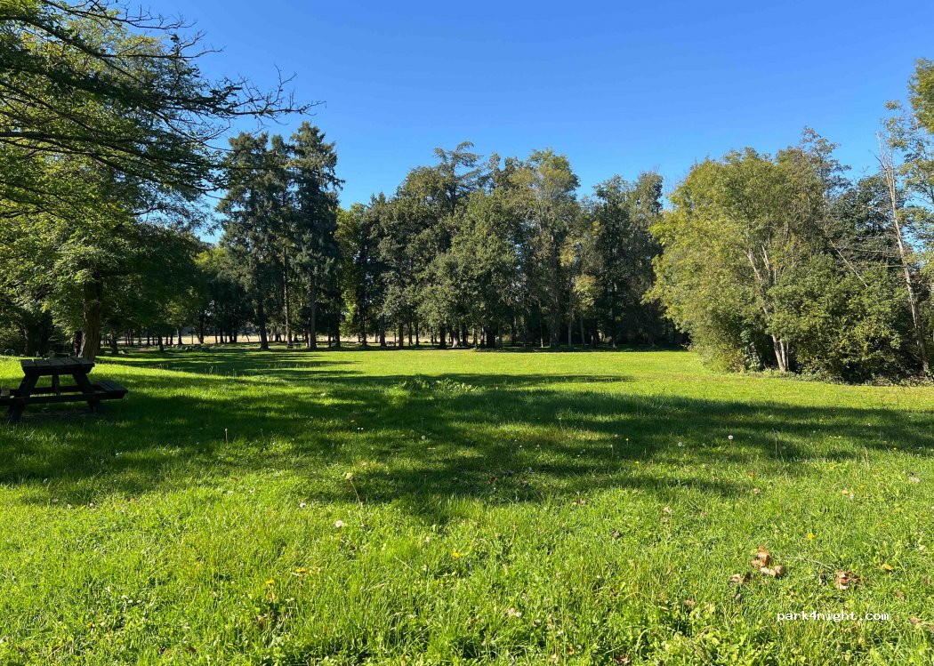 Aire de pic nique très agréable entre le prieuré et une rivière . Une dizaine de tables et bancs au calme