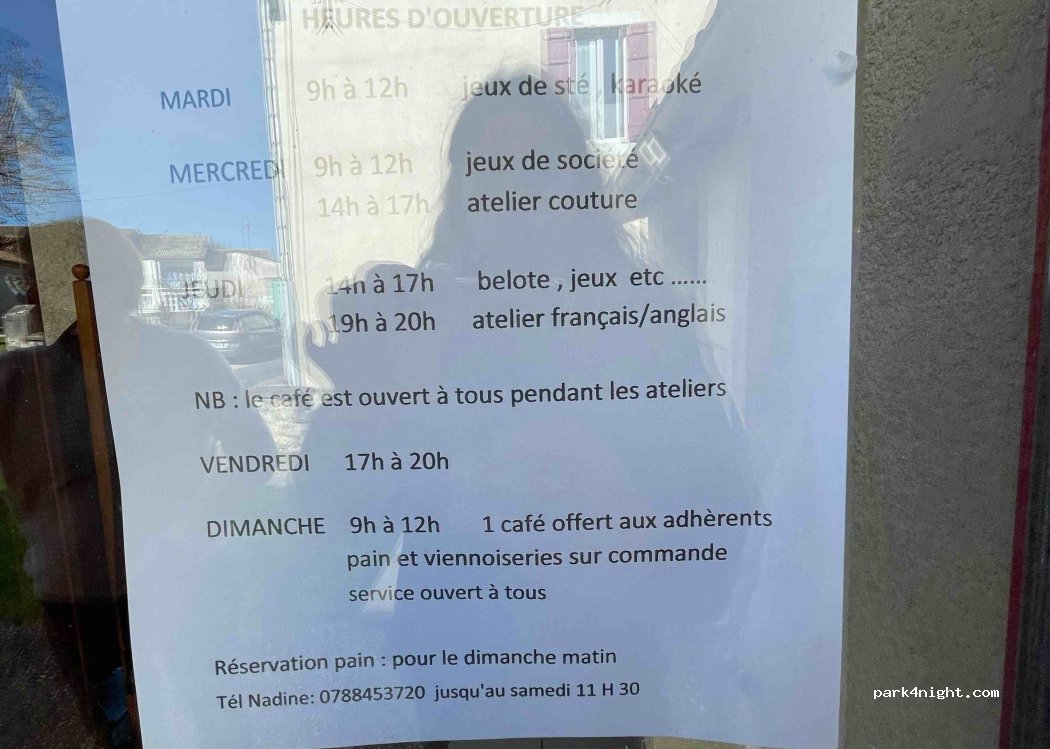 Le restaurant est ouvert et propose des menus entrée plat dessert. Néanmoins fermé les lundi et dimanche. Au village camion pizza le lundi soir avant 20h30. WC au dessus à côté de la salle communale et de la boîte aux livres. Parfait pour notre halte nuit et promenades du chien. Plutôt recommandé pour van ou fourgon.