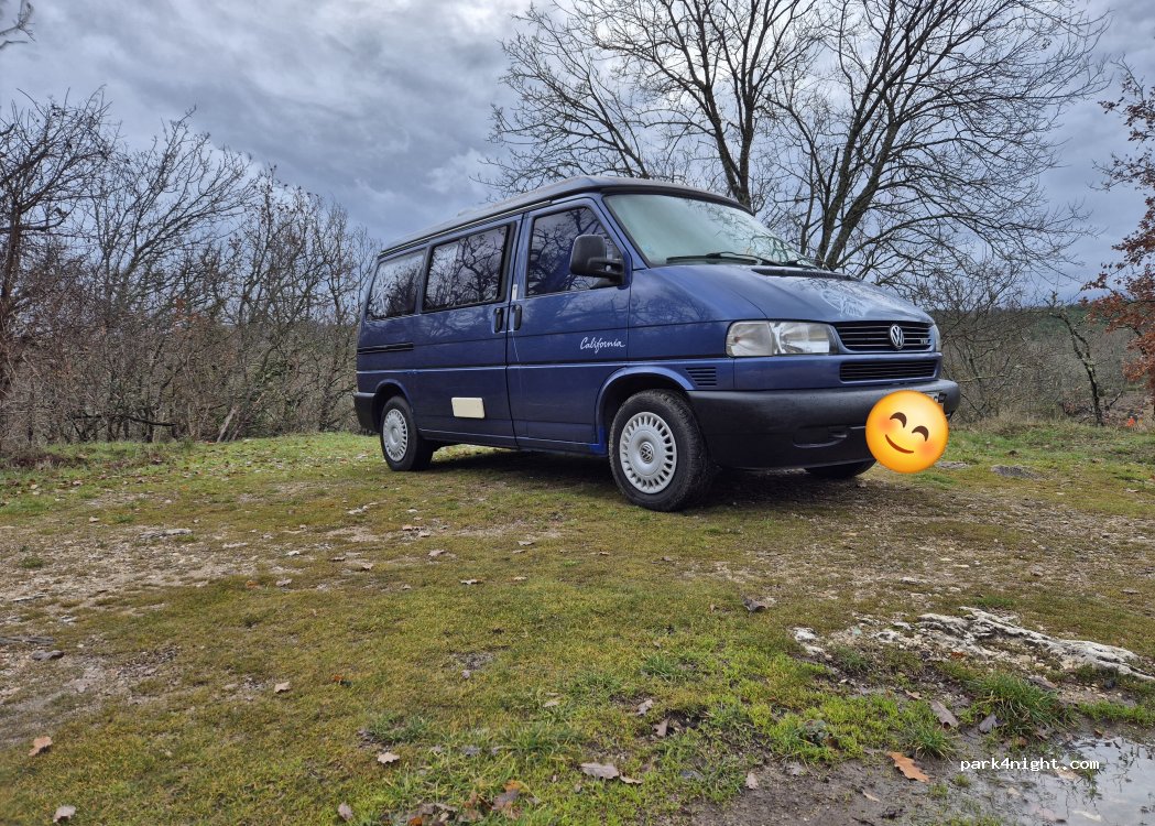 Very large parking lot of the Baume Obscure cave with picnic tables and toilets. 2 km hilly road but passable by camper. Very calm place.