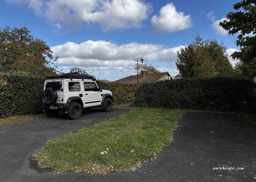 Arrêt repas, 4 places dont 1 occupée par caravane en garage, pratique en dépannage. Grand détour pour y accéder. Merci à la municipalité.