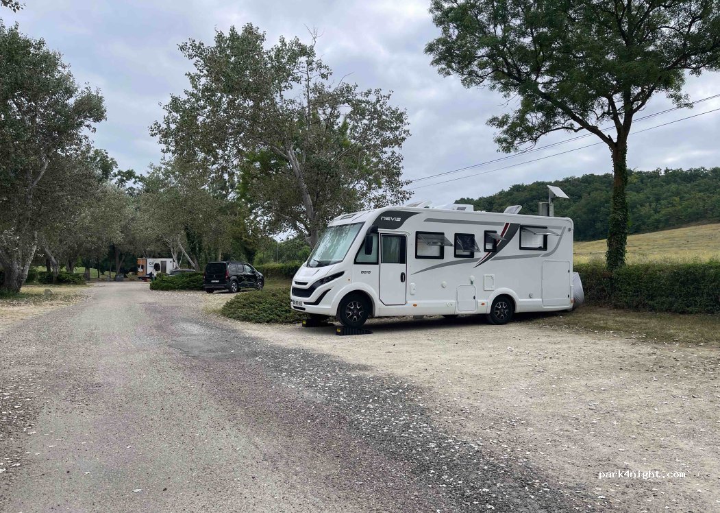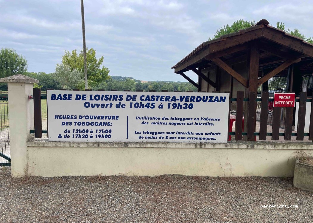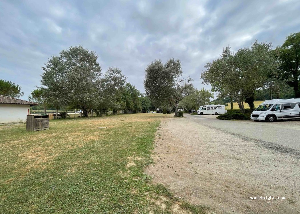 Parking de la base nautique. Ouvert aux véhicules y compris les camping-cars. Pas de barrières ni de restrictions de hauteur. Pas de services autres que des poubelles. Bar et restaurant ouverts en haute saison.
